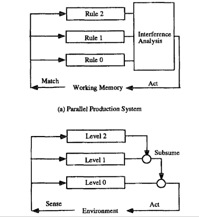 Let us compare the architectures of parallel produc tion systems and a subsumption architecture [Brooks, 1986]2. Figure 3(a) illustrates parallel production sys tems, while Figure 3(b) represents the subsumption architecture considered. The difference between them is the role of mediators. In parallel production systems, the centralized mediator detects and avoids interfer ences among rules. In the subsumption architecture, the distributed mediator inhibits the lower level ac tivities. Since, the mediator could be distributed in parallel production systems [Ishida, 1991]14, there is no serious difference among them. By generalizing the mediator’s process, a parallel production system can represent systems based on a subsumption architec ture.
