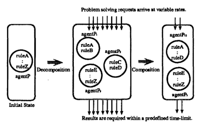 Organization self-design is useful when real-time constraints exist and production systerm have to adapt to changing environmental requirements. When over loaded, individual agents decompose themselves to in crease parallelism, and when the load lightens the agents combine with each other to free extra hardware resources. Figure 4 shows the behavior of organiza tional adaptation.