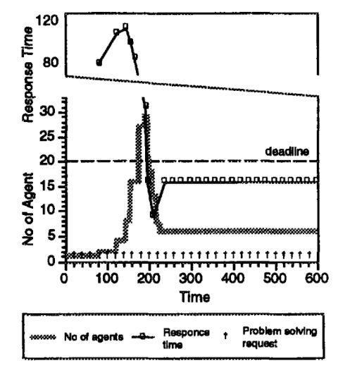 Figure 7 shows the evaluation results. In this figure, communication and reorganization overheads are ignored. The line chart indicates response times normalized by production cycles. The step chart represents the number of agents in the organization. The time limit is set at 20 production cycles, while the measurement period is set at 10 production cycles. In Figure 7, problem solving requests arrive at constant intervals. Around time 100, the response time far exceeds the time limit. Thus the organization starts decomposition. Around time 200, the number of agents has increased to 26, the response time drops below the time limit, and the organization starts composition. After fluctuating slightly, the organization finally reaches a stable state with the number of agents settling at 6. Since composition and decomposition have been interleaved, the firing ratios of the resulting agents are almost equal. This chart show that the society of agents has gradually adapted to the situation through repeated reorganization.