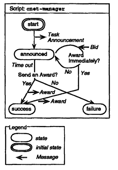 In AgenTalk, inter-agent protocols are defined by finite state autonmata. Using AgenTalk, Kuwabara describes the behavior of the manager following the contract net protocol. Task allocation in the contract net protocol is performed as follows: First, a manager with a task to be executed broadcasts a Task Announcement message. A contractor that is willing to execute the announced task sends a Bid message. The man ager selects a contractor to which the task is to be allocated and sends an Award message to it. The man ager script arise-manager is shown in Figure 8. The cnet-manager script is supposed to be invoked when the task to be allocated is generated.