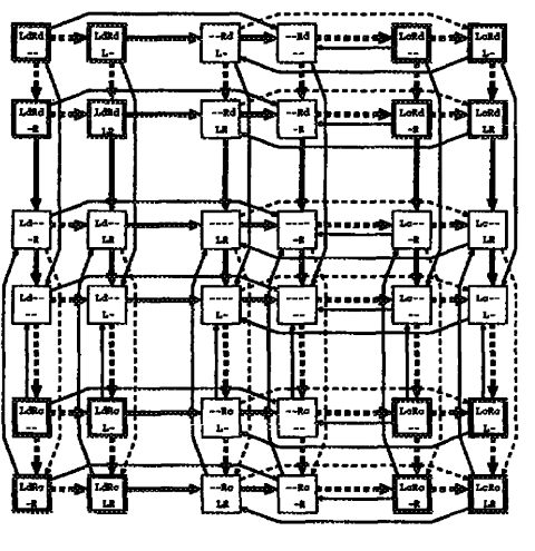 A more interesting approach is to introduce machine-learning techniques into inter-agent protocols. Some classes of distributed algorithms can be represented by state transition diagram. Let us start with the famous “dining philosophers,” based on Chandy and Misra’s algorithm [Chandy and Misra, 1988]3. Figure 9 illustrates the state transition diagram of a hungry philosopher. Each box represents a philosopher’s state. Upper line indicates whether a philosopher possesses L(left) and R(right) forks, and whether each fork is e(clean) or d(dirty). Lower line indicates whether a philosopher receives a request from L(left) and R(right) neighbors. There are two kinds of state transitions: active and passive. The former is triggered by the philosopher himself. However, the latter is triggered by neighboring philosophers, and thus the probabilities of state transitions are not known at the beginning. In Figure 9, solid edges represent active transitions, and dashed edges represent passive transitions. The state transitions allowed by Chandy and Misra’s algorithm are represented by thick edges. The challenge here is to learn the state transitions represented by thick edges through repeatedly interacting with other philosophers. Reinforcement learning algorithms such as Q-learning can be basis for solving this problem.